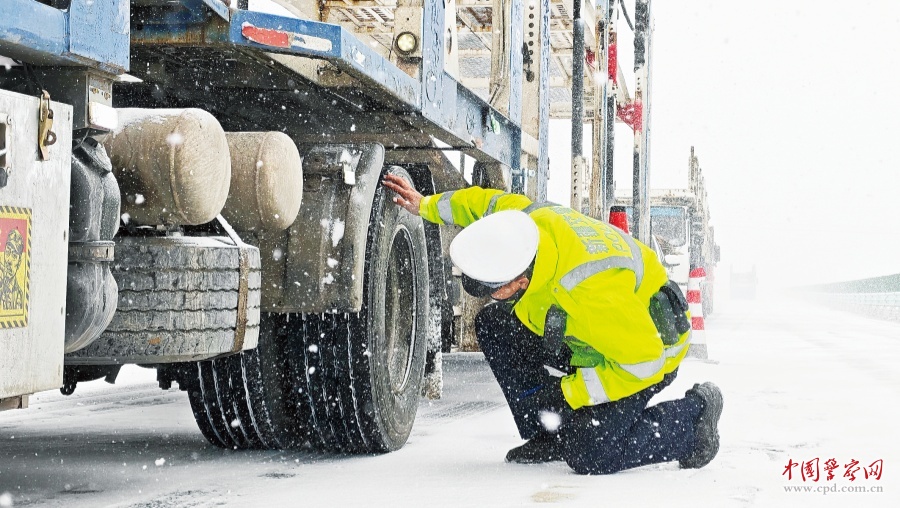 11月4日,新疆维吾尔自治区克孜勒苏柯尔克孜自治州出现降雪导致部分路段结冰。乌恰县公安局交通管理大队迅速启动应急预案,组织民警赶赴现场疏导交通,保障驾乘人员平安。图为民警检查车辆安全隐患。沙 辉 摄
