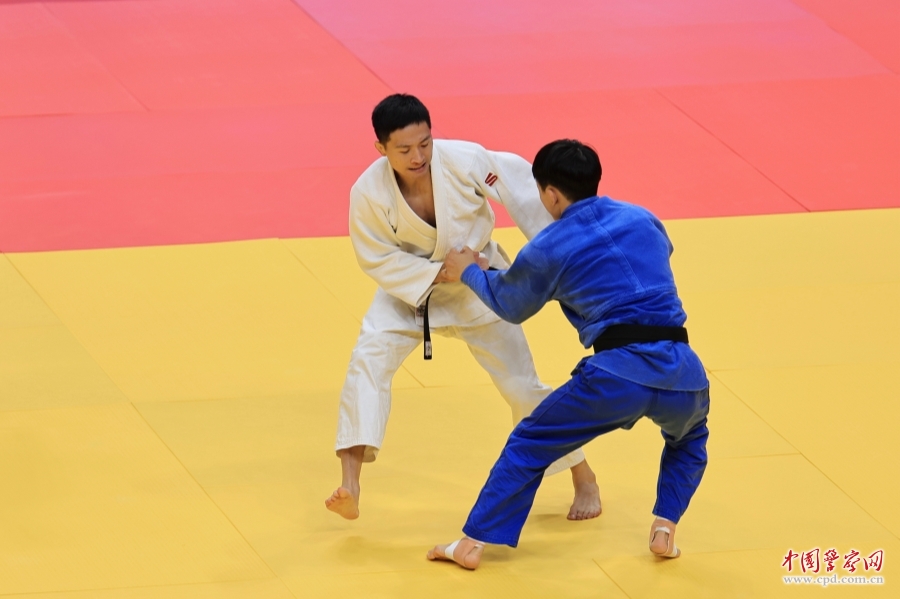 11月10日,中国公安体育协会运动员商义(白方)出战十五运会柔道比赛。